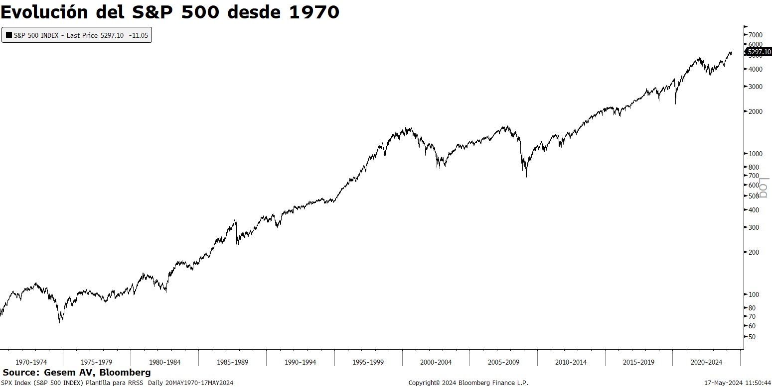 Como ves, desde 1970 hasta ahora ha habido caídas, momentos peores y mejores, pero siempre ha acabado recuperándose para marcar nuevos máximos. Por tanto, sí, a largo plazo conviene mantenerse invertido.